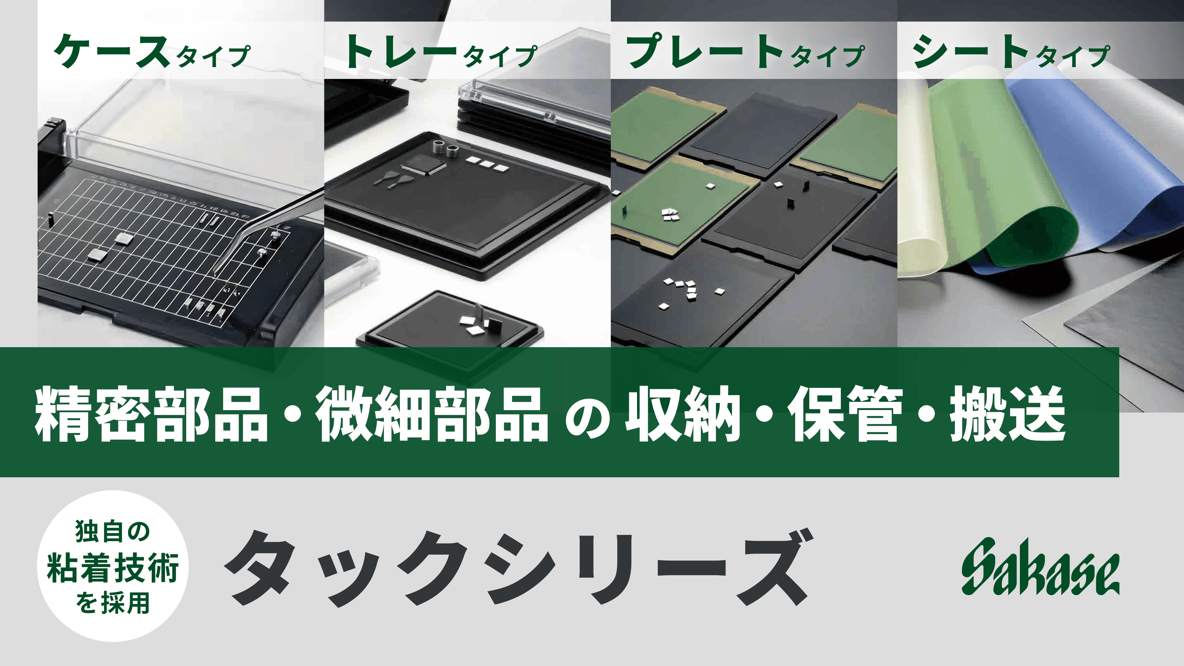 「タックシリーズ」は、ゴムのような粘着性と弾性を利用して、精密部品の保管・搬送を「安全」かつ「効率的」に行うための製品(治具)です。半導体、MEMS、レンズ、電子部品などの繊細な製品や、精密な治具・工具などを安全に保管・搬送、保護、保持します。