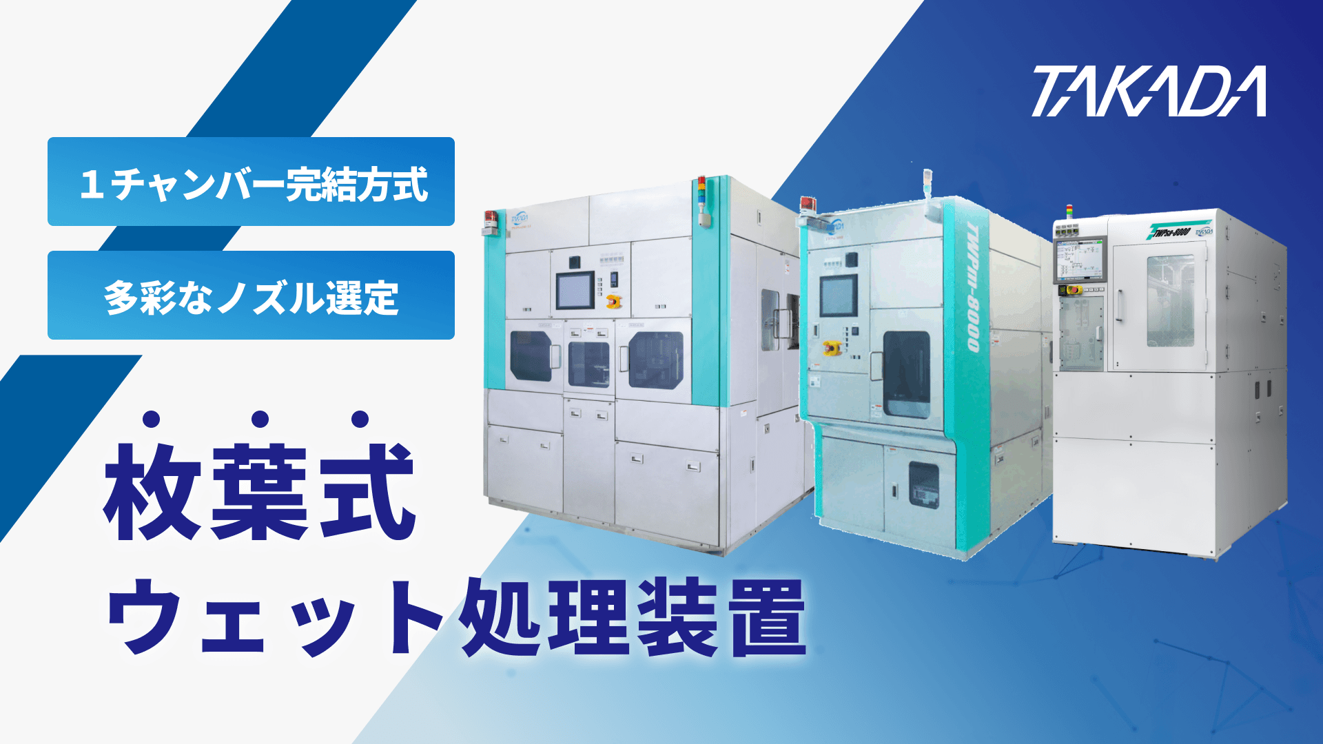 株式会社高田工業所(以下、TAKADA)の枚葉式ウェット処理装置「TWPシリーズ」は、有機溶剤を用いたレジスト剥離やリフトオフ工程を得意とするウェット処理装置です。特に、MEMS、パワーデバイス、高周波デバイス、光デバイスといった分野で、高難易度のレジスト剥離や残留物(ポリマーやフェンスなどの反応生成物)除去に対応。